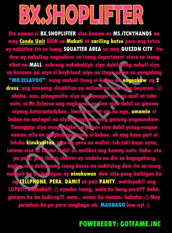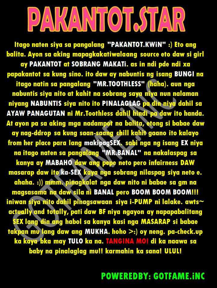 DA HU ITONG GIRL NA TOH NA NAPABALITANG PINIKOT LANG ANG KANYANG ASAWA NGAUN NA SI *TOOT* NUN NABUNTIS ITO. :) ETO ANG KWENTO, NAGREKLAMO ANG NANAY NITO SA BARANGGAY PARA LANG PANAGUTAN NI *TOOT*. AT KAPAG NDI DAW ITO PANAGUTAN, DEDEMANDA DAW UNG LALAKE. AHAKS. DESPERADA TEH?? AT AYON PA SA AKING SOURCE, SOBRANG BITTER AT PANGET DAW UGALI NITO. MABAET DAW SA UNA PERO PAG MEJU TUMAGAL, LUMALABAS DAW TOTONG UGALI NITO. PAPANSIN ITO SA GM. NAGALIT PA NGA TO SAKIN DAHIL TINIRA KO SA GM UNG ASAWA NIYANG SI *TOOT*. HAHA. :)) SIYA PO AY 21 YO NUN NABUNTIS. AT AYON PA DITO SA AKING SOURCE, SINISISI DAW NG NANAY NITO SI "BABAENG CHATTER NA KBIGAN DN NIYA" DAHIL SA PAGDADALANG-TAO NITO. POTA TEH, LA KA BA SARILING UTAK? UNG ISANG BABAE BA MAY HAWAK NG KEPS MU? AHAHAHA!! KALECHE TOH AA!! XA BA UNG BUMUKAKA PARA SAYO? AH BASTA NAGSISIMULA SA "H" THUG NG BABAENG NAMIKOT NA TOH. :) KILALA NIYO NA BA?